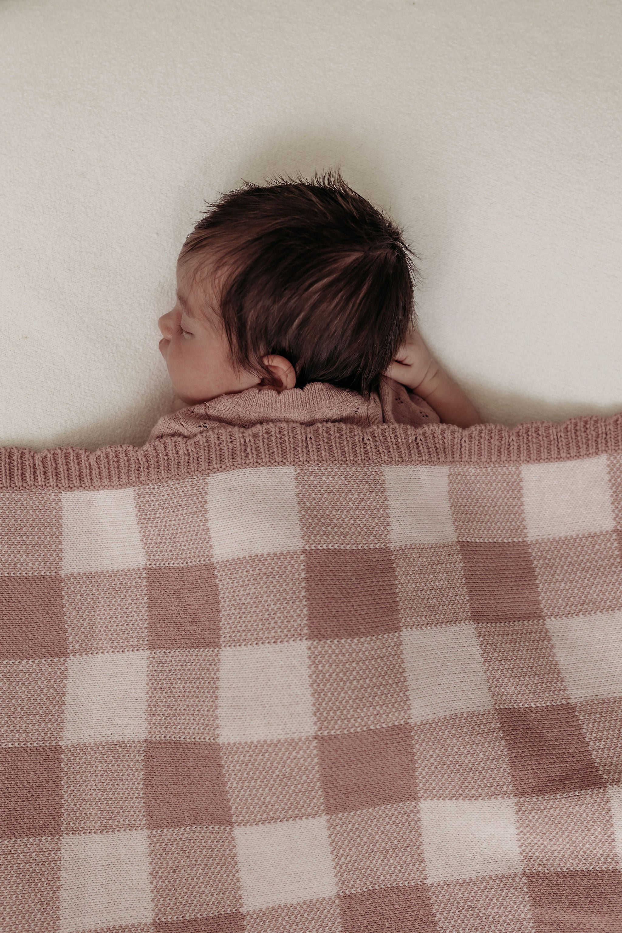 Experience the timeless charm of our Rose & Oat Gingham Check Baby Blanket, where modern design meets classic elegance. Our Rose melange yarn is a beautiful dusky pink, combined with a soft neutral Oat melange. This blanket is finished with our signature scalloped trim.