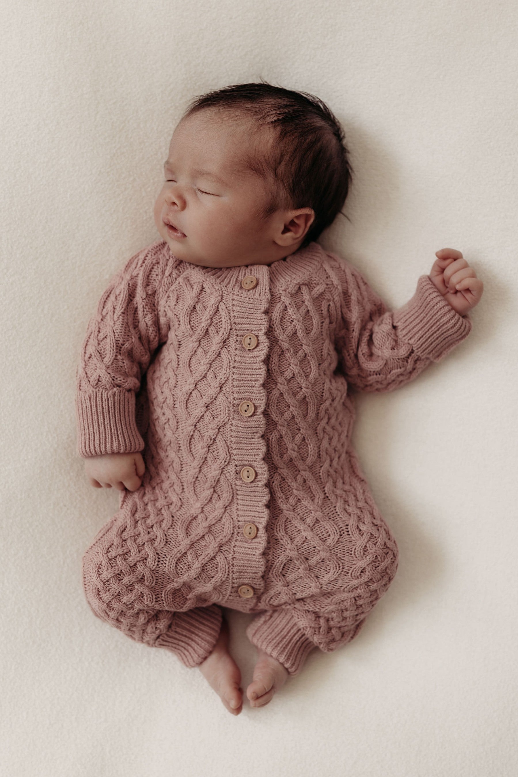 Discover our Rose Cable Knit Baby Romper. Crafted from exceptionally soft organic cotton, this beautiful romper offers unparalleled comfort for your baby. Knitted in our bestselling dusky rose yarn with intricate cable stitching and adorned with our signature scalloped trim, this baby romper makes a stunning new baby gift and a truly timeless heirloom piece.